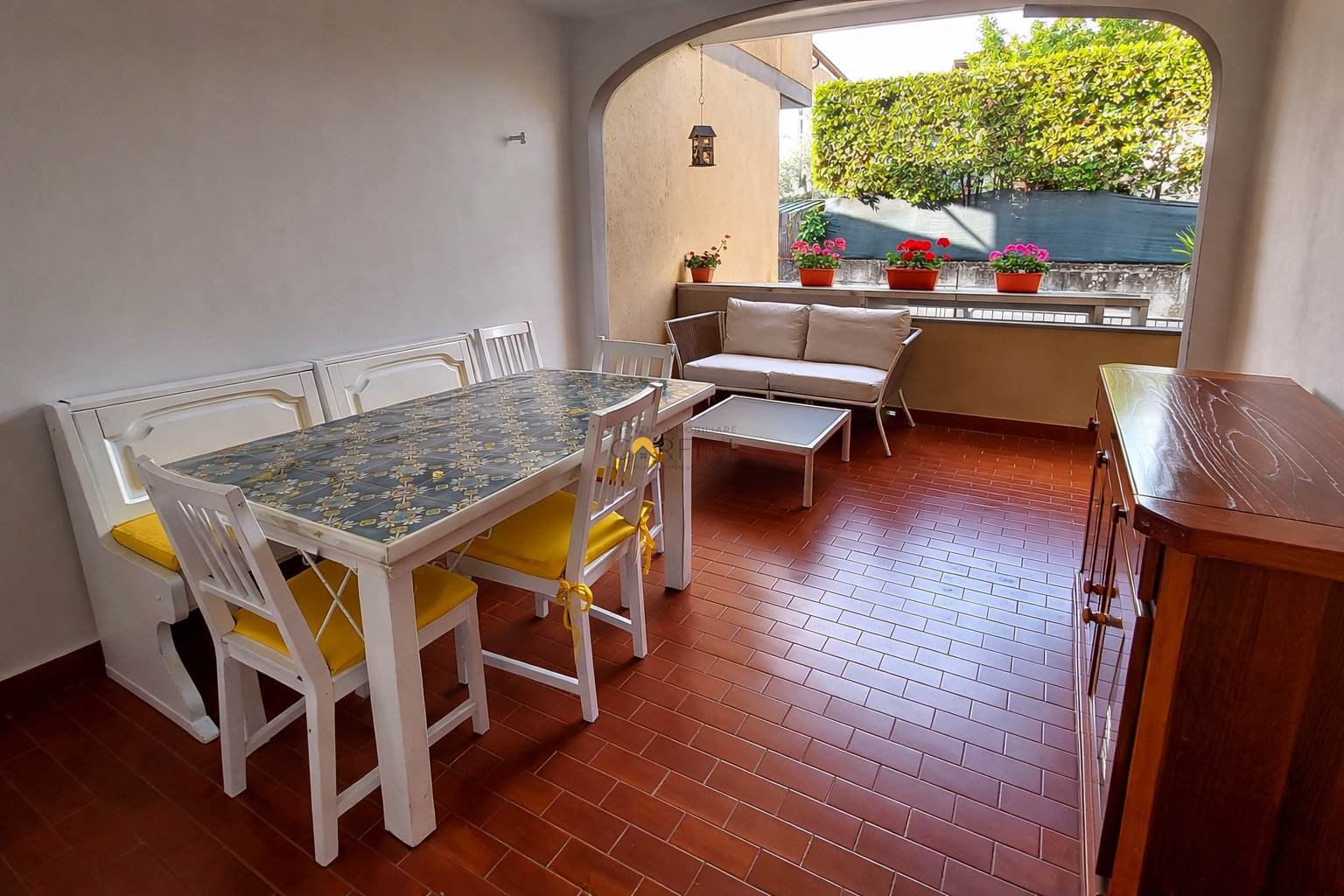 Sulla parte frontale dell'abitazione, troviamo inoltre una comoda veranda attrezzata per mangiare all'aperto.