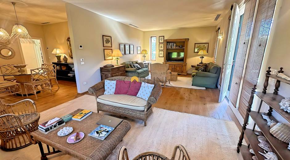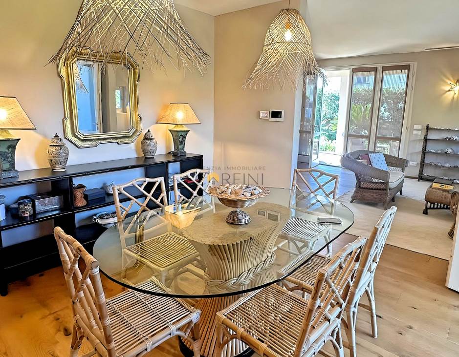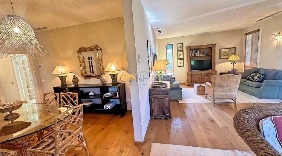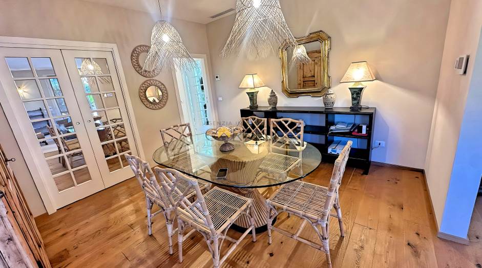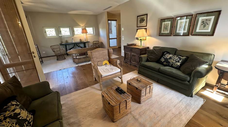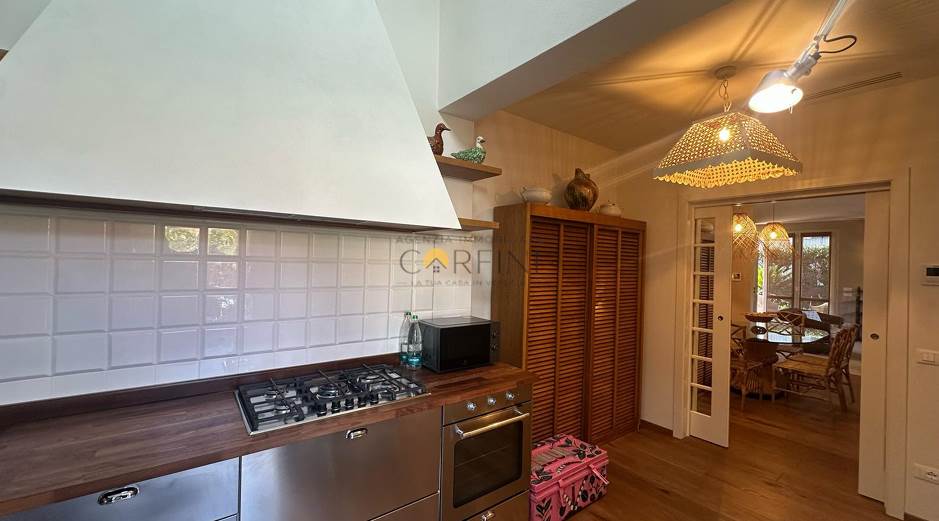 L’ingresso avviene attraverso una veranda avvolta da piante e fiori, che introduce con dolcezza agli ampi spazi living e alla zona pranzo, luminosi e armoniosi. La cucina, funzionale ed elegante, si apre direttamente sul giardino, creando una continuità naturale tra interno ed esterno. Qui, la piscina diventa il centro della vita quotidiana: un invito costante al relax, dalla mattina fino alle ore più calde del tramonto.